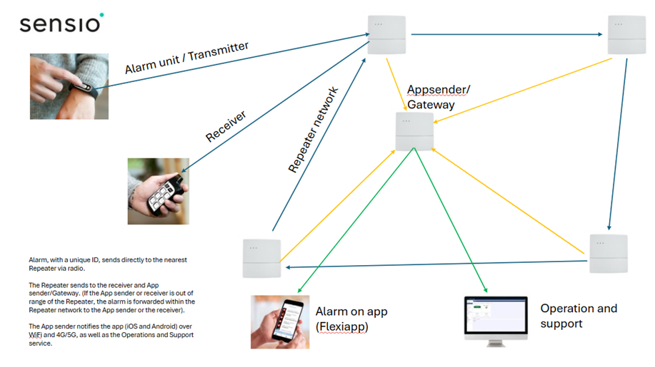 Repeater forsterker signalene i et Vea Care system. Flere Repeatere kan settes opp i et Repeater-nett for å dekke flere etasjer og store bygg.